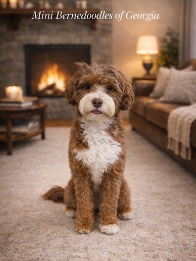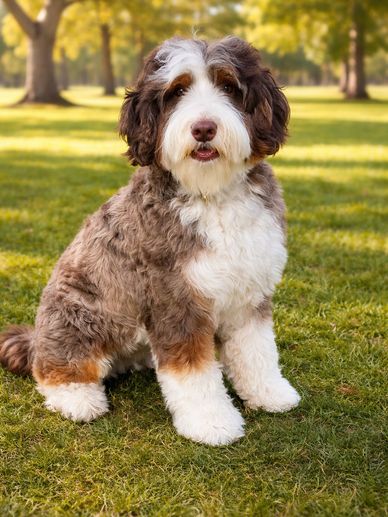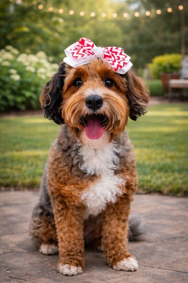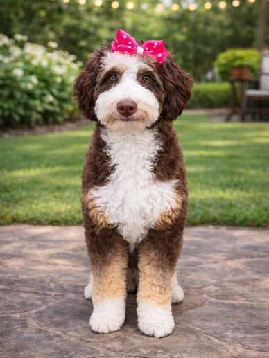 Gucci is a standout Brown Tri Mini Bernedoodle who quickly set herself apart from her littermates in both presence and personality. Held back from Mango’s litter, she captured our attention with her gentle, goofy charm and naturally outgoing nature. Gucci loves to be part of the action—whether that’s joining in on a dance in the kitchen or happily mingling with kids, family members, and other dogs. She brings together confidence, sweetness, and an easygoing spirit that makes her a joy to be around.